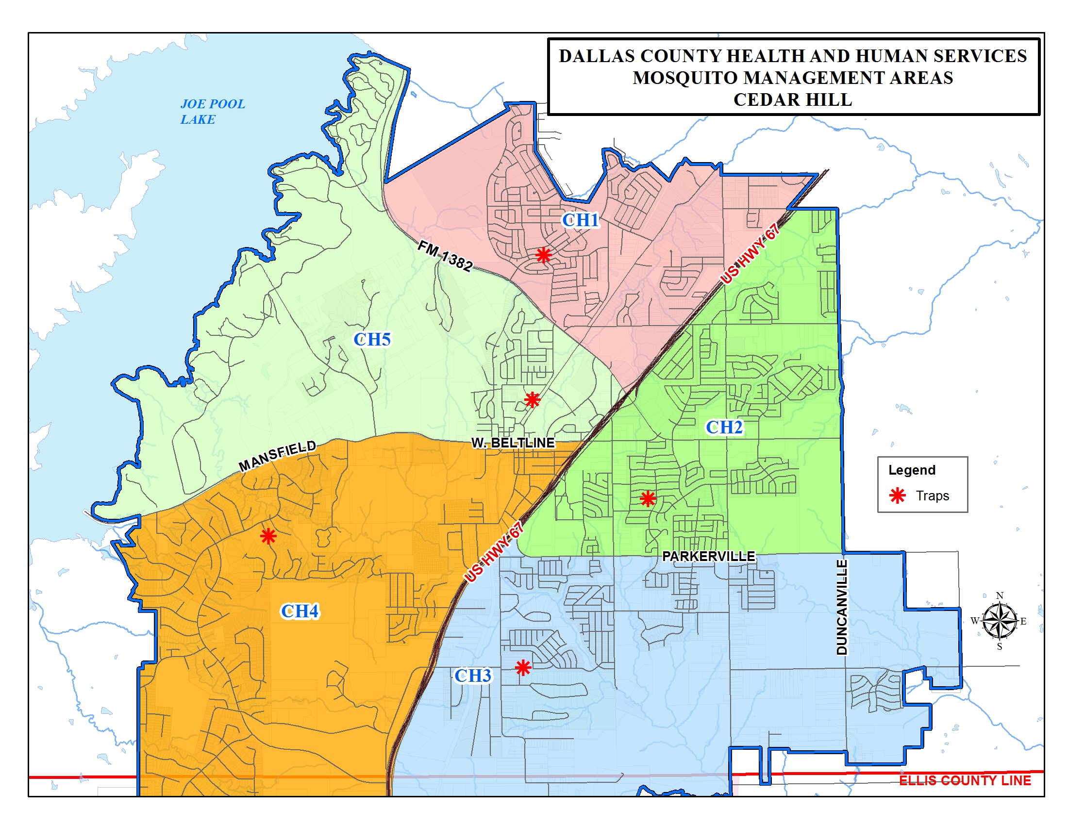 The City of Cedar Hill partners with Dallas County Health and Human Service (DCHHS) to conduct the West Nile Virus surveillance and testing program. Each week, mosquito traps are set, collected and tested in mosquito management areas (MMA). Mosquitoes are tested for West Nile Virus (WNV). When a "pool" of mosquitoes tests positive for WNV, DCHHS schedules vector control spraying in the MMA where the positive sample was trapped. The spraying takes place at night from a truck mounted sprayer.