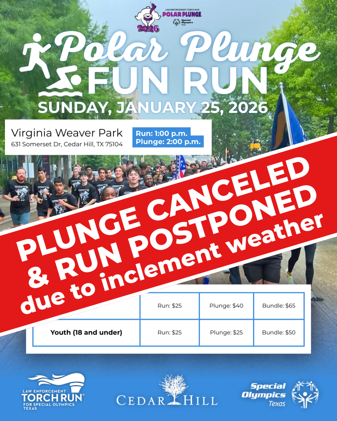Due to unsafe weather conditions, Special Olympics Texas has announced the 2026 Cedar Hill Polar Plunge has been canceled with an alternate event option available, and the Cedar Hill Torch Run has been postponed.