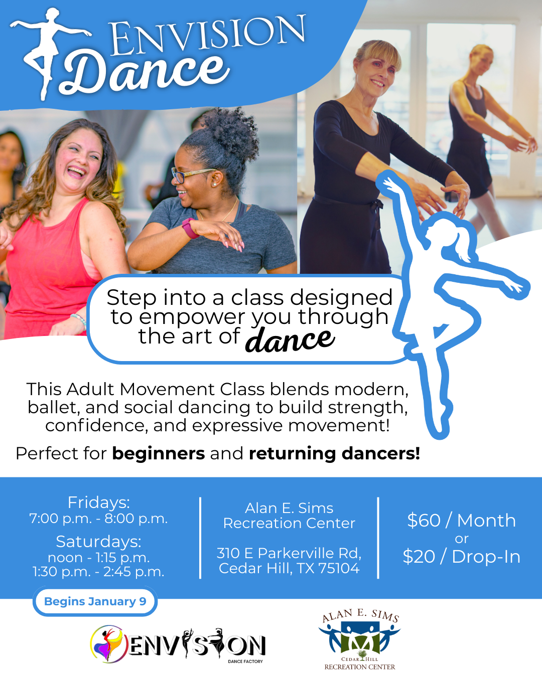 This Adult Movement Class blends modern, ballet, and social dancing to build strength, confidence, and expressive movement! Perfect for beginners and returning dancers!