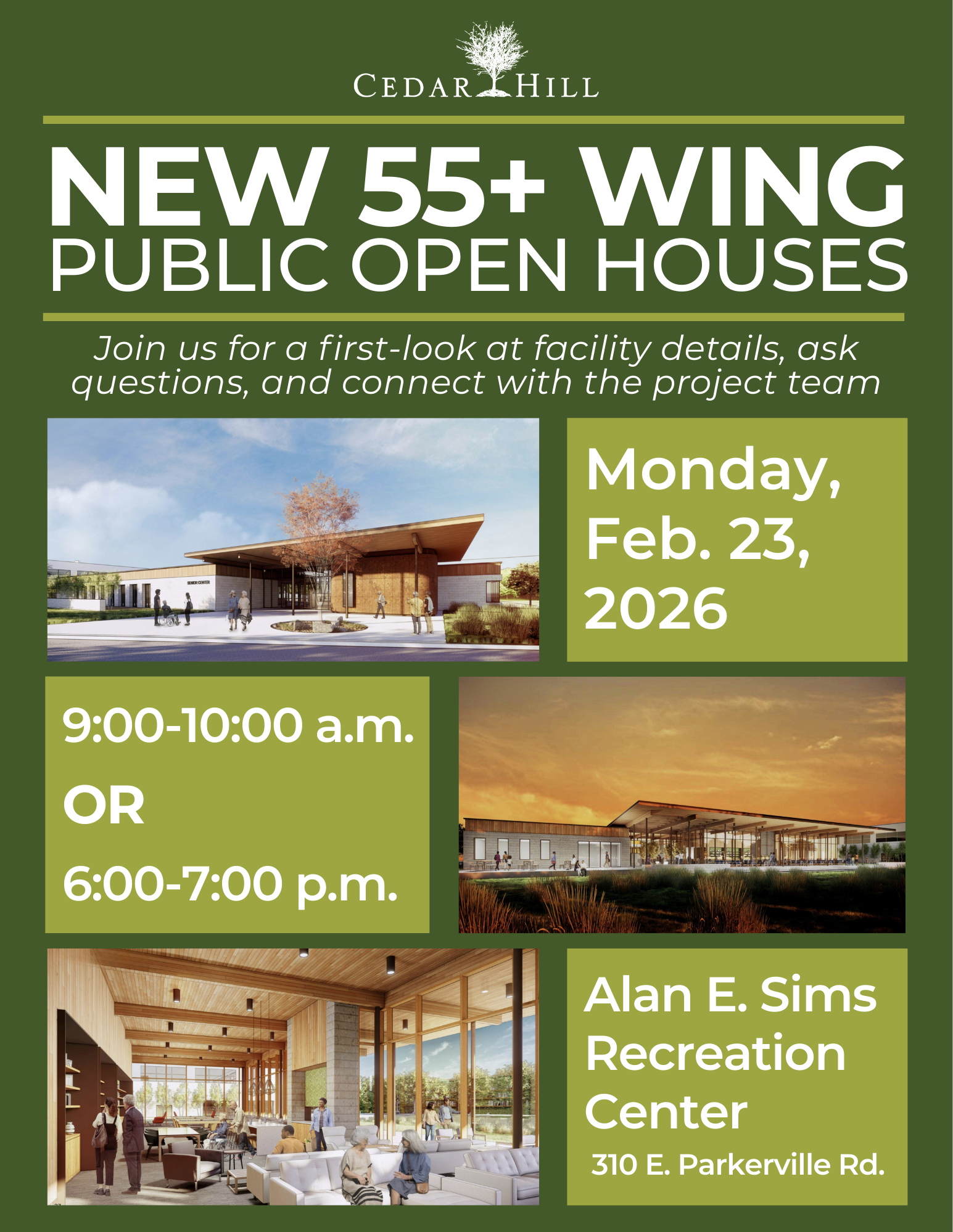 After 5 years of public input, a design has been selected for the New 55+ Wing coming to the Alan E. Sims Recreation Center! Join us for a first-look at facility details, ask questions, and connect with the project team.